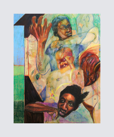 acrylic, marker, oil pastel, glitter glue, and shellac on canvas