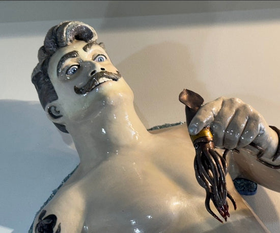 mixed media, including fender guitar picks, wood, plaster, resin, reclaimed materials, and clay
